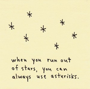 “Asterisks. It always bugs me when they’re uneven.” She exclaimed almost as matter-of-factly as some of the statements I’d spoken a day prior. She lovingly accepted my faux pas after a straightforward explanation of their unsettling origin. From there it was all lip gloss and SkipBo. Hours upon hours of that drunken card game where the dealer is always accused of stacking the deck and toes tap each other with random flirts from under the table.